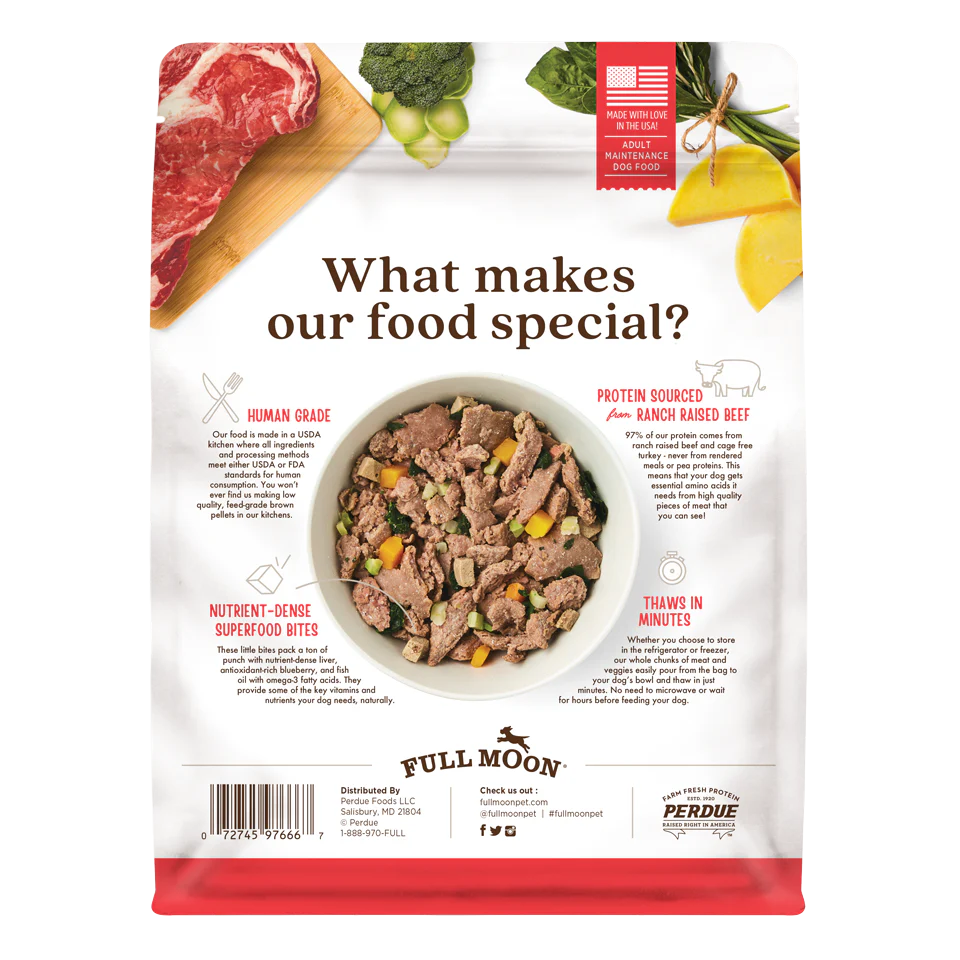 Tired of asking “where’s the beef” in kibble? We put protein front and center with fresh pieces of meat you can actually see! High quality USDA ranch raised beef, broccoli, and butternut squash will keep you and your dog hooked.